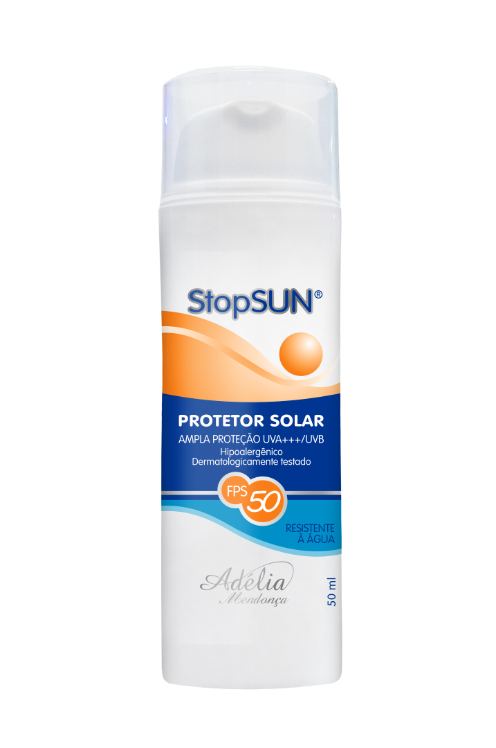 STOP SUN possui ampla proteção UVA e UVB que protege contra os efeitos nocivos do sol, além de seus ativos, Vitamina E (acetato de tocoferol), Extrato de Aloe vera, D-Pantenol, PCA sódico, Hialuronato de sódio, que hidratam, protegem e auxiliam na prevenção do envelhecimento precoce, reduzindo a formação de radicais livres, proporcionando saúde e beleza à sua pele. STOP SUN protege sua pele até 50 vezes mais do que sem a sua aplicação. Resistente a água e ao suor. Evitar exposição prolongada ao sol, principalmente no período entre 10-16h. Dermatologicamente testado.