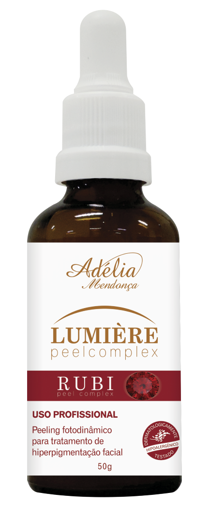 Rubi Photopeel Complex é um sérum formulado para uso associativo em terapias fotodinâmicas com leds e laser de baixa potência. Sua composição alia alfa e polihidroxi-ácidos; complexos minerais orgânicos; rubi micronizado; prata metálica pura; esfoliantes enzimáticos; ativos auxiliadores de clareamento nanoencapsulados e inovadores ativos fotodinâmicos, que convertem os raios solares do espectro ultravioleta em energia para o auxílio do clareamento da pele. Possui atuação otimizada nos comprimentos de onda 470nm e 650nm (led azul e vermelho), potencializando tratamentos estéticos em casos de hiperpigmentações. Uso profissional. Dermatologicamente testado. Este produto não apresenta parabenos em sua composição e foi formulado de maneira a minimizar possível surgimento de alergia.