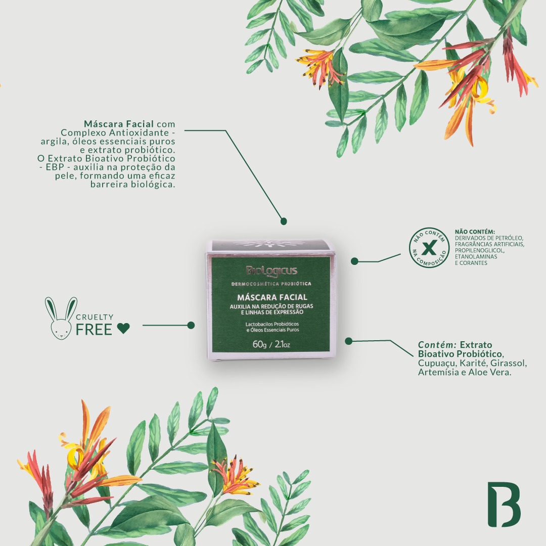Máscara com Complexo Antioxidante – argila, óleos essenciais, puros e extratos de células probióticas. Os Extratos Bioativos Probióticos – EBP* - exercem uma ação de proteção na pele, formando uma eficaz barreira biológica. Auxilia na redução de rugas e linhas de expressão