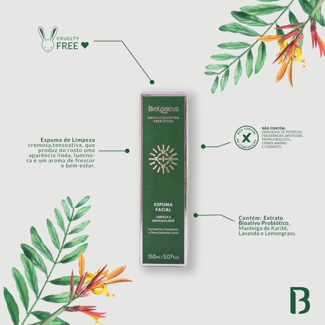 Espuma de Limpeza cremosa, tensoativa, que produz no rosto uma aparência limpa, luminosa e um aroma final de frescor e bem-estar. Os Extratos Bioativos Probióticos – EBP*, desenvolvidos na Biologicus por meio de processos biotecnológicos, tem ação imunomoduladora e atuam equilibrando o pH e fortalecendo o sistema de defesa da pele. A Espuma de Limpeza Facial age sem romper a barreira protetora da sua pele. Pode ser usada, igualmente, como demaquilante.