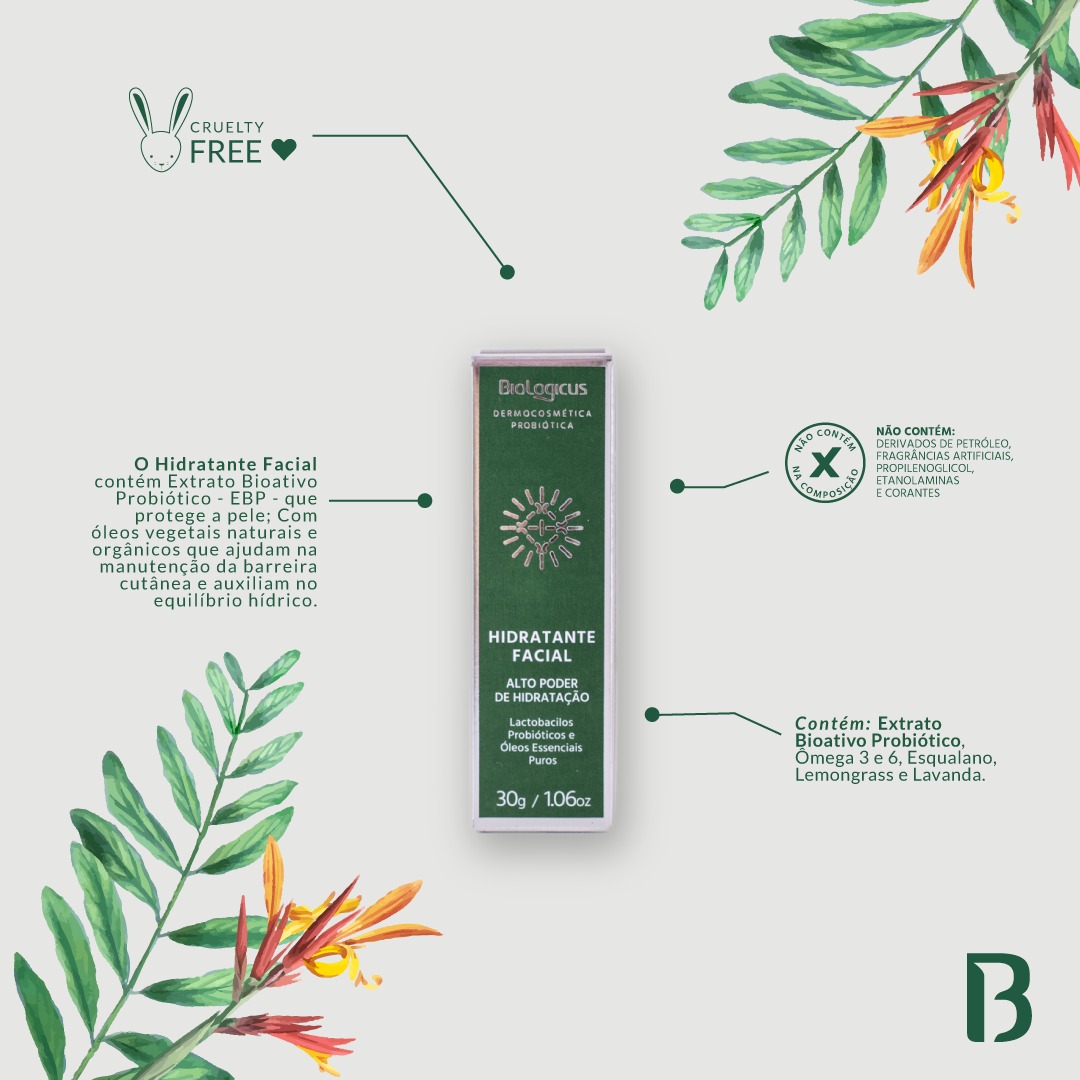 O Hidratante Facial contém Extratos Bioativos Probióticos – EBP* - e microorganismos probióticos vivos que protegem a pele. Os Ômegas 3 e 6 ajudam na manutenção da barreira cutânea e restabelecem o equilíbrio hídrico, retardando o envelhecimento da pele. Alto poder de hidratação, deixando a pele aveludada.